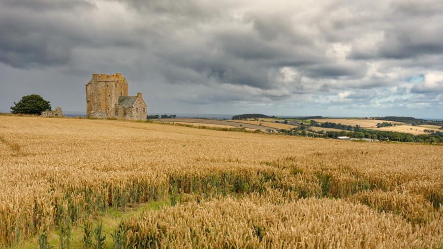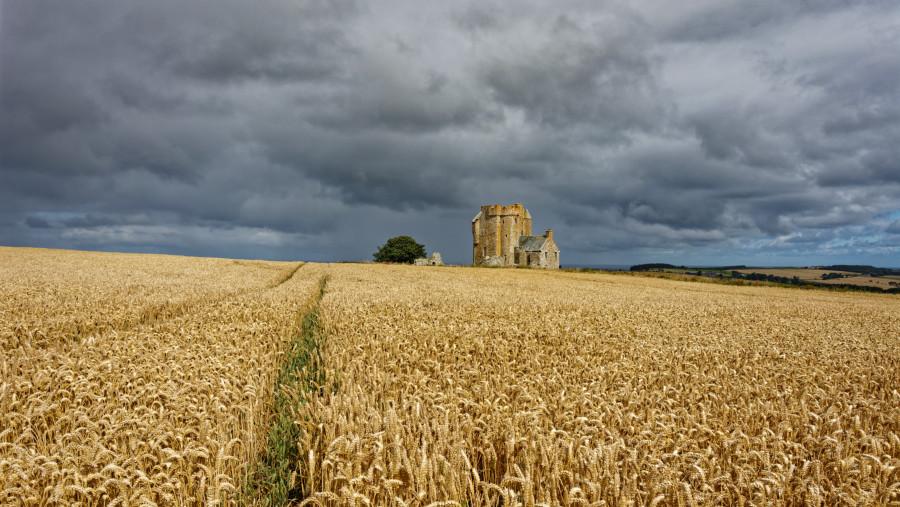 Burg im Kornfeld mit düsteren Himmel im Hintergrund