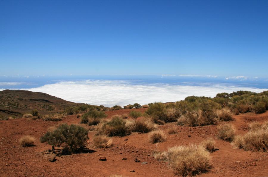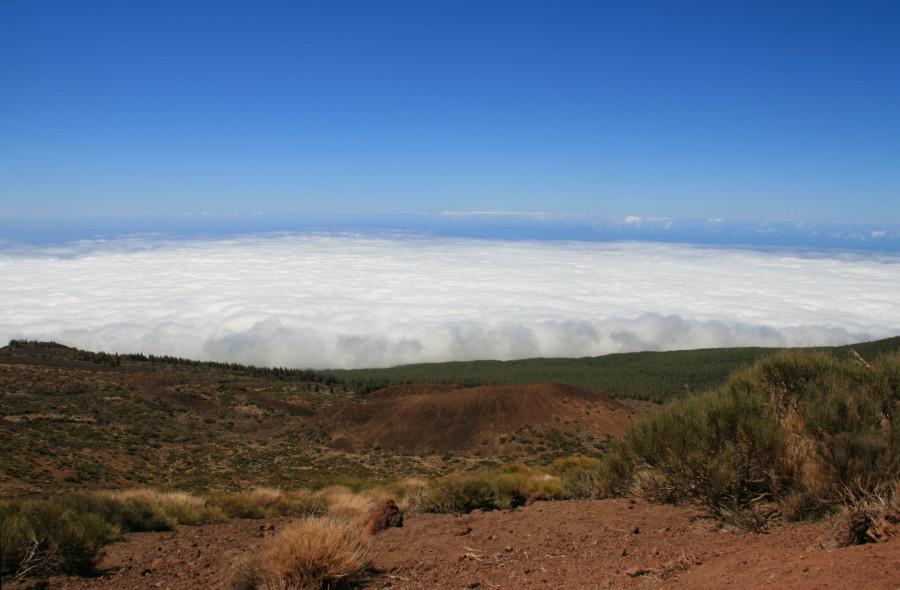 Wolkenmeer mit Roter Erde und grüner Vegetation auf Teneriffa