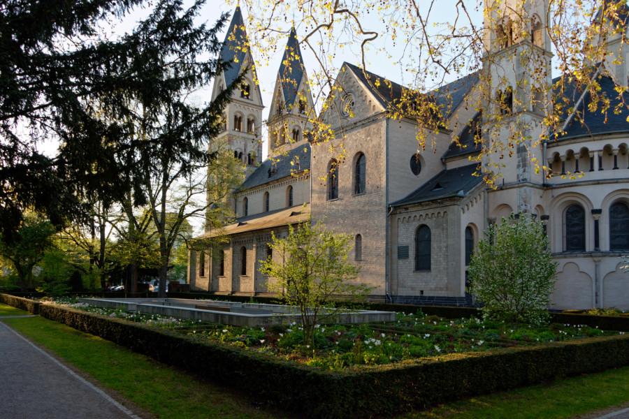 Garten einer historischen Kirche im romanischen Stil in Koblenz an Rhein und Mosel